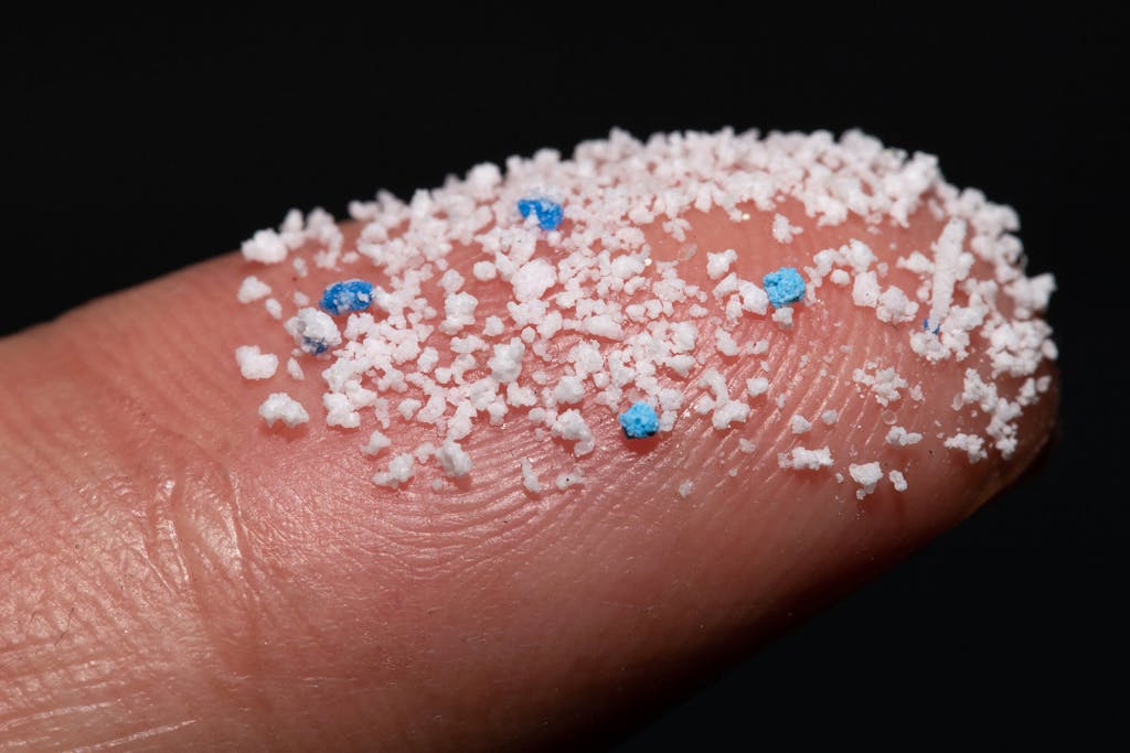 Microplastic pellets, shown here on a fingertip, are extremely small pieces of plastic debris found nearly everywhere in the environment, resulting from the disposal and breakdown of consumer products and industrial waste. Photo: Chayanuphol