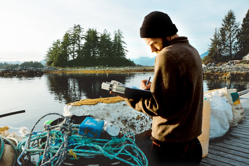 A man works to clean up marine waste from the beaches and waters of Clayoquot Sound on the west coast of Vancouver Island, Canada. Data from remote beach cleans is recorded, tracked and used to create public-facing programs and campaigns to create systemic change for pollution from plastics and debris. Photo: Nicole Holman/Climate Visuals