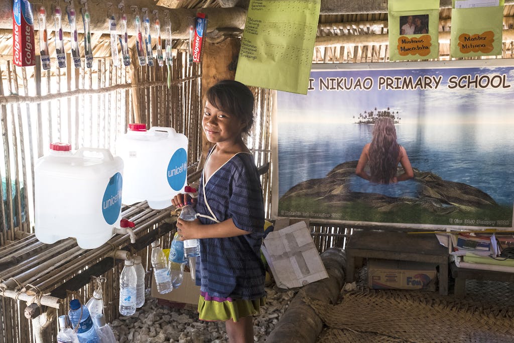 A female student of Nikuao Primary School in Kiribati refills her water bottle from reusable containers sponsored by UNICEF. Photo: Vlad Sokhin / UNICEF