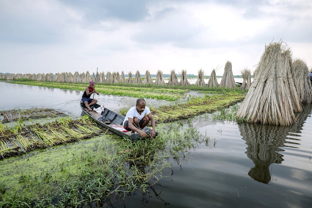 Two men harvest jute crops and stack them for drying in India. Jute, which is one of the best alternatives to plastic products, has become an increasingly popular crop to grow in West Bengal. Photo: Dipayan Bose/Climate Visuals